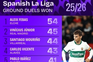 西甲地面拼抢成功次数排行:维尼修斯45次第二 姆巴佩40次第七